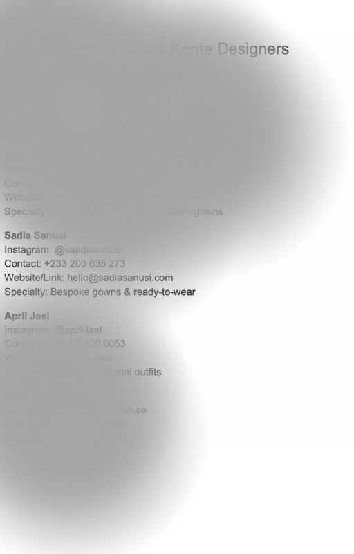 The Tailor Hub Ghana Bespoke Tailor & Fashion Vendor Directory (2025 Edition) features verified, listed tailors and designers who create women's outfits (traditional attire, kente, brides etc)